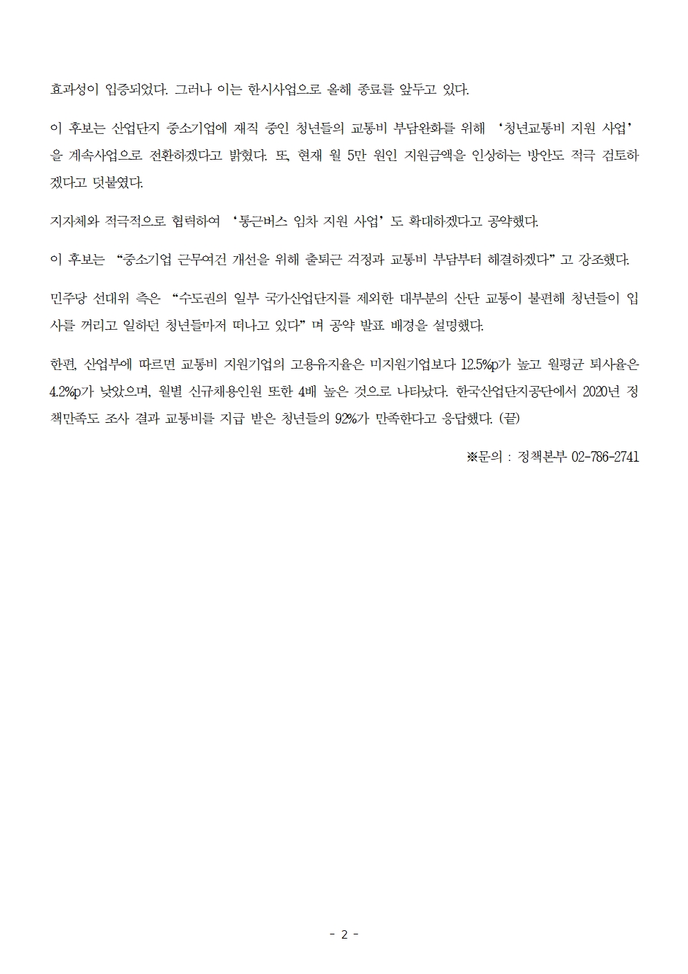 [보도자료] 더불어민주당 선대위 정책본부, '이재명은 합니다. 소확행 공약 시리즈 82' 산업단지 재직 청년 통근부담 완화 공약 발표