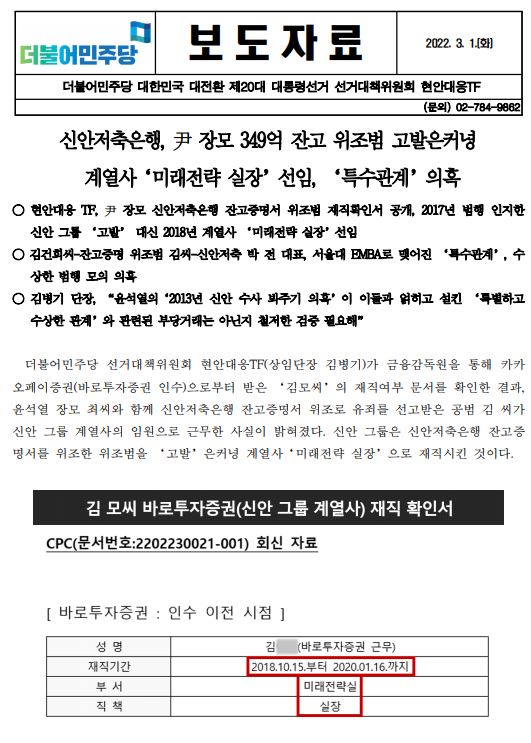 [보도자료] (더불어민주당 선대위 현안대응TF) 신안저축은행, 尹 장모 349억 잔고 위조범 고발은 커녕 계열사 ‘미래전략 실장’ 선임, ‘특수관계’ 의혹