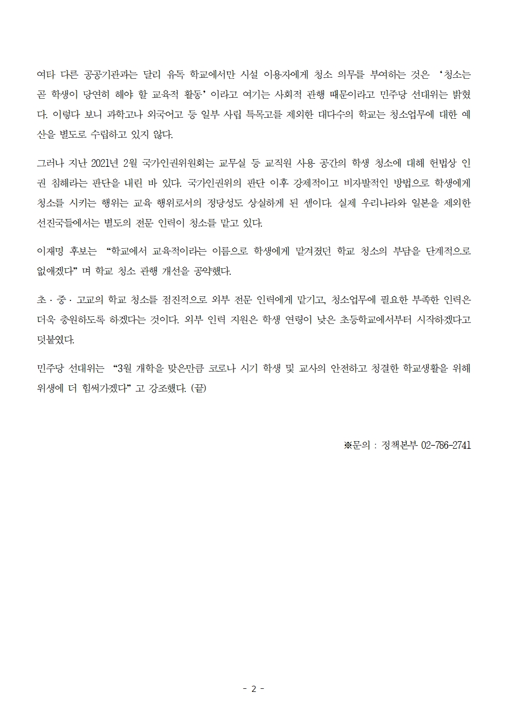 [보도자료] 더불어민주당 선대위 정책본부, '이재명은 합니다. 소확행 공약 시리즈 84' 학교 청소 전문 인력 지원 공약 발표