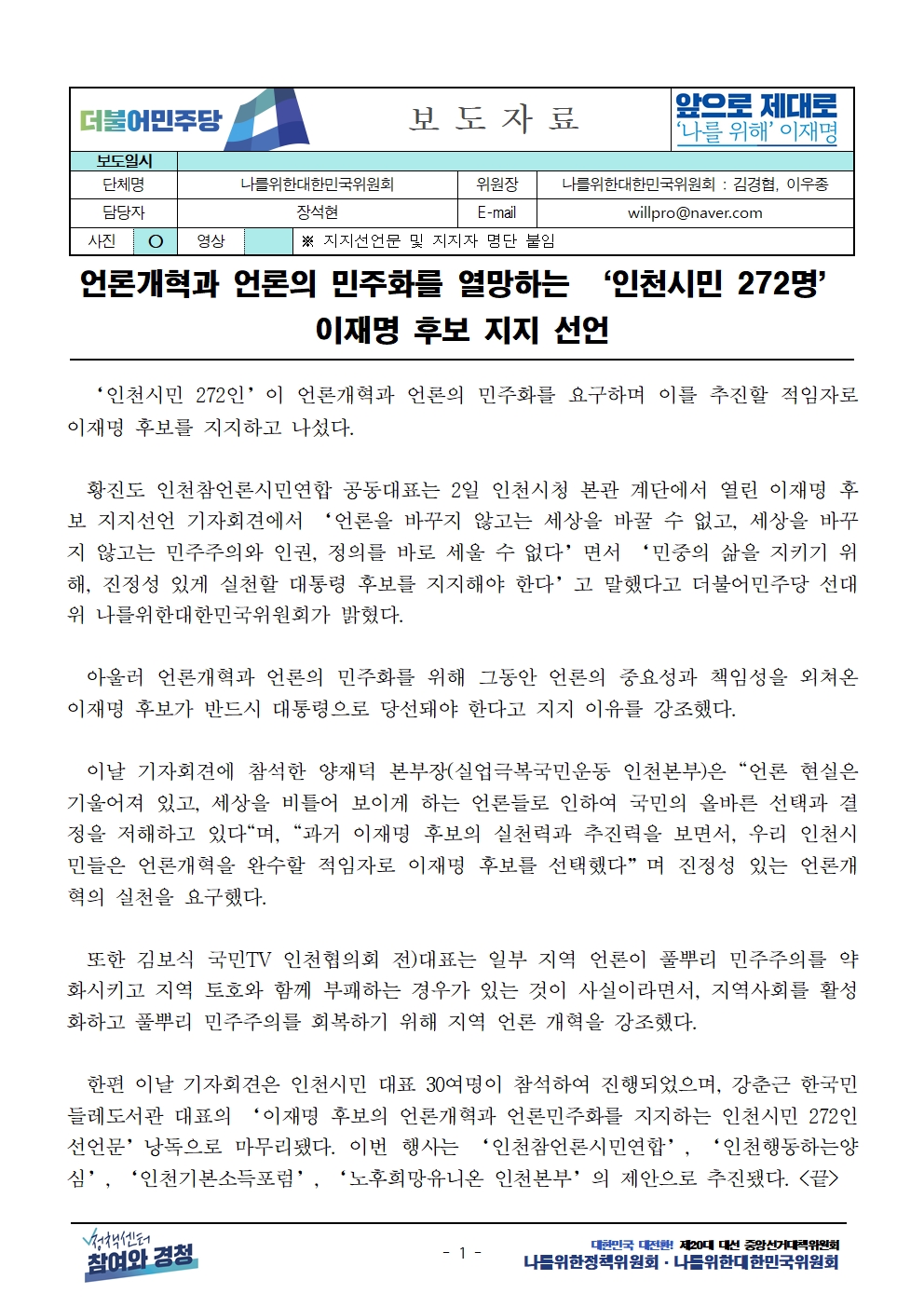 [보도자료] 더불어민주당 선대위 나를위한대한민국위원회, 언론개혁과 언론의 민주화를 열망하는 ‘인천시민 272명’ 후보 지지선언