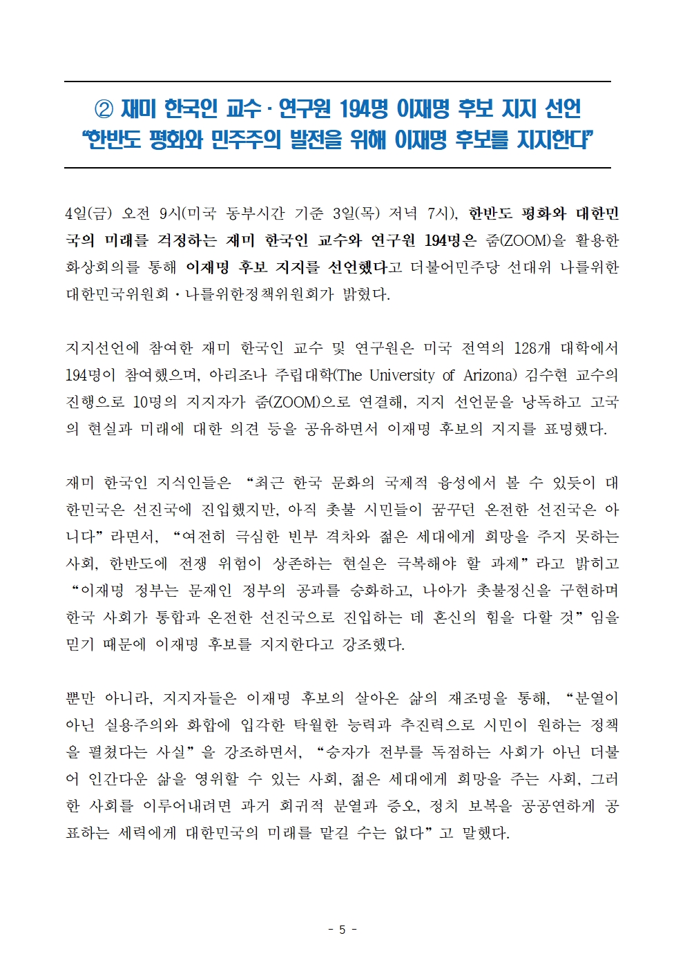 [보도자료] 더불어민주당 선대위 나를위한정책위원회·나를위한대한민국위원회, 소상공인 단체 1만인, 재미 한국인 교수·연구원 194명, 만화인 및 웹툰작가 224명 후보 지지선언