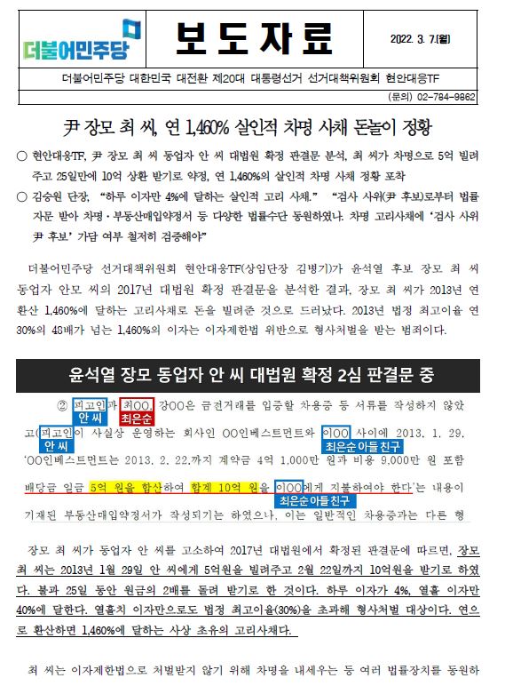 [보도자료] (더불어민주당 선대위 현안대응TF) 尹 장모 최 씨, 연 1,460% 살인적 차명 사채 돈놀이 정황