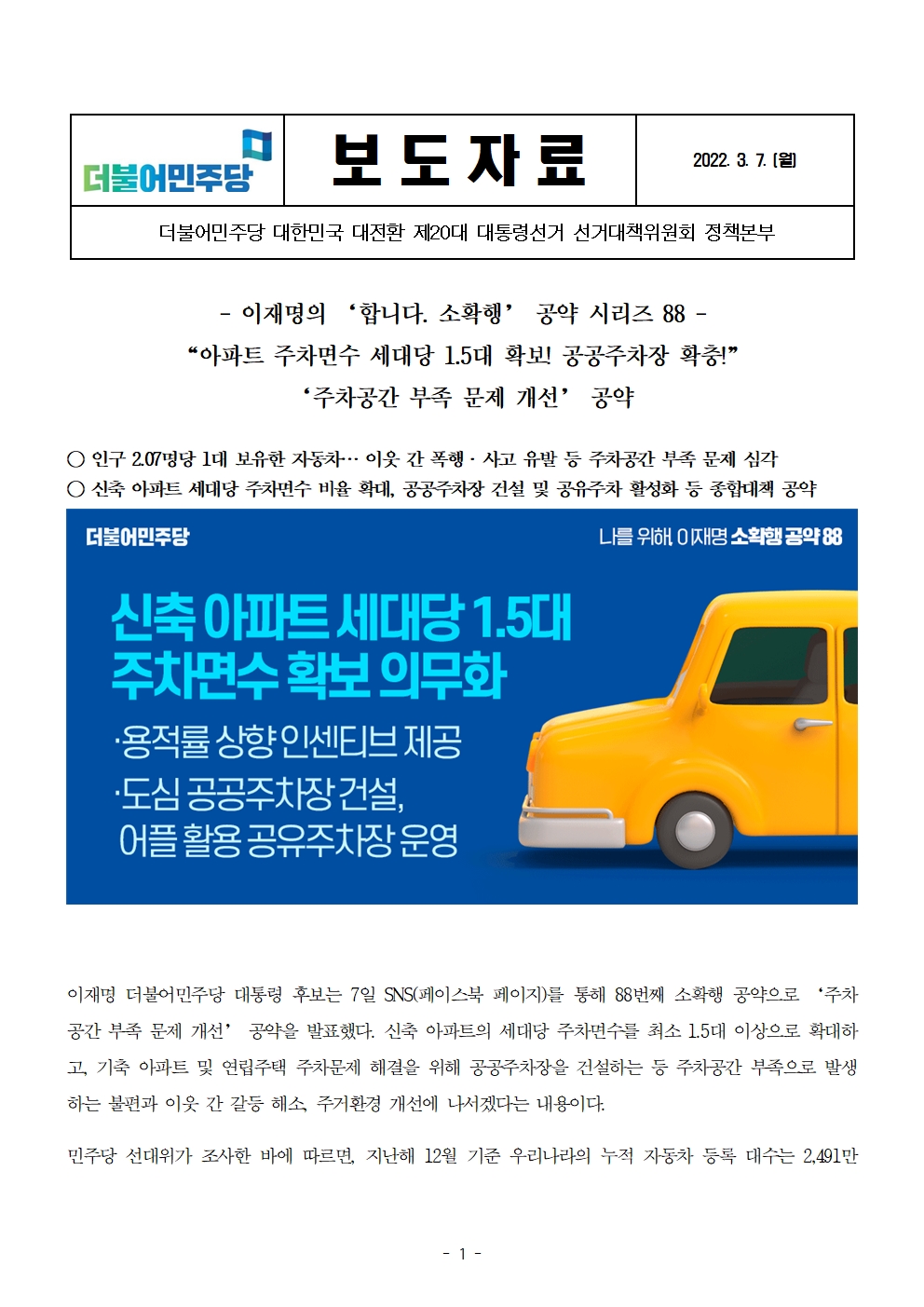 [보도자료] 더불어민주당 선대위 정책본부, '이재명은 합니다. 소확행 공약 시리즈 88' 주차공간 부족 문제 개선 공약 발표