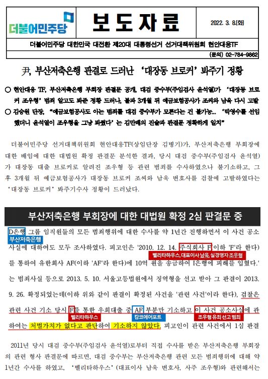 [보도자료] (더불어민주당 선대위 현안대응TF) 尹, 부산저축은행 판결로 드러난 ‘대장동 브로커’ 봐주기 정황