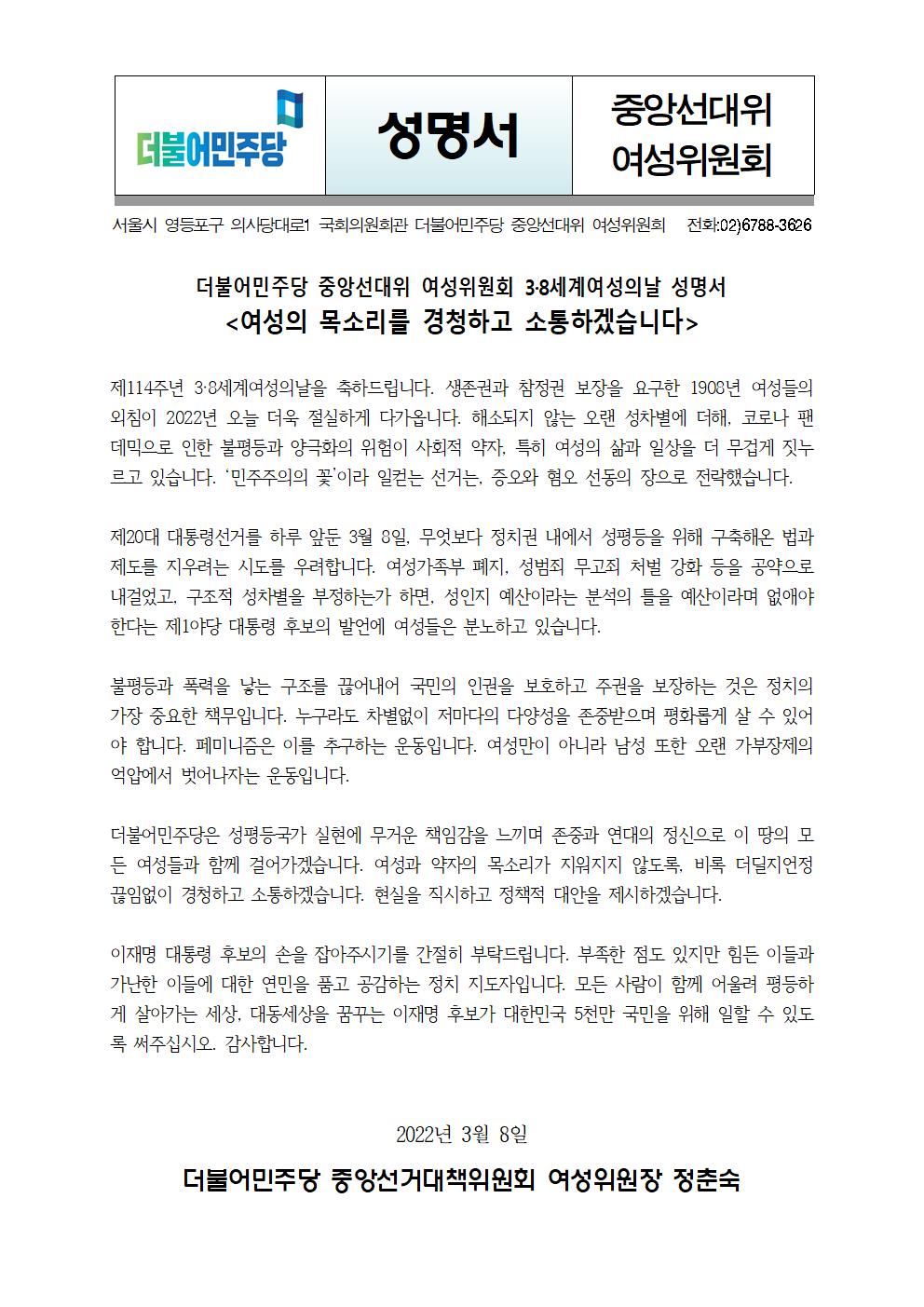 [성명서] 더불어민주당 선대위 여성위원회 3.8세계여성의날 여성의 목소리를 경청하고소통하겠습니다