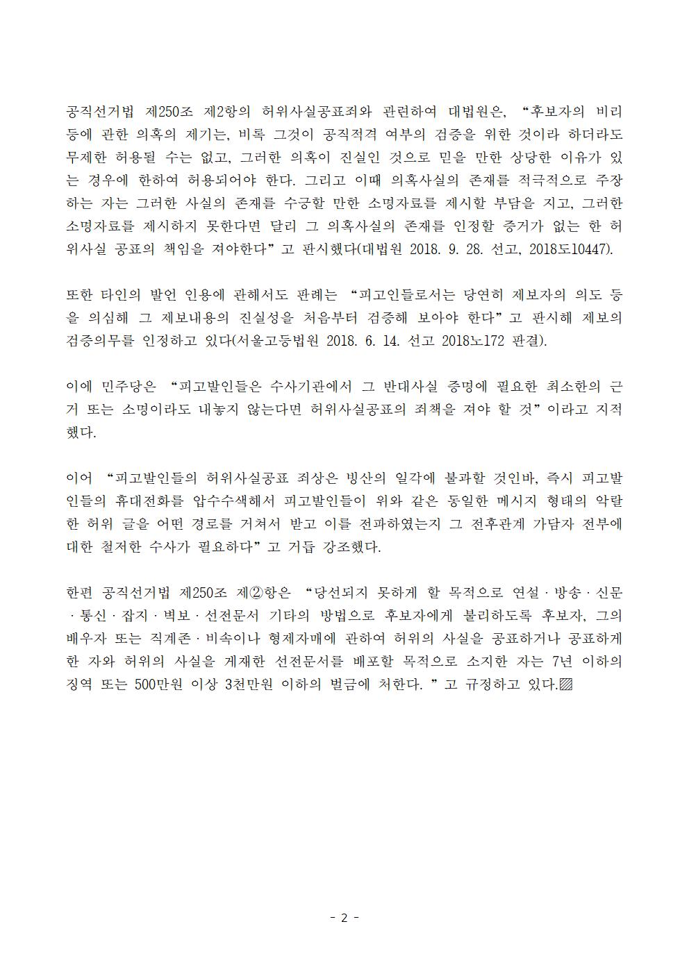 [보도자료] 더불어민주다 국민검증법률지원단 허위사실 유표 관련자 전원 고발