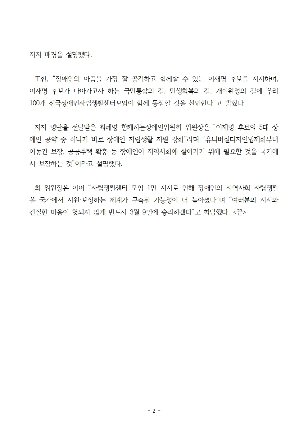 [보도자료] 더불어민주당 선대위 함께하는장애인위원회, 전국장애인자립생활센터 1만명 후보 지지선언