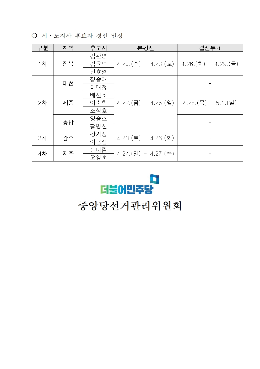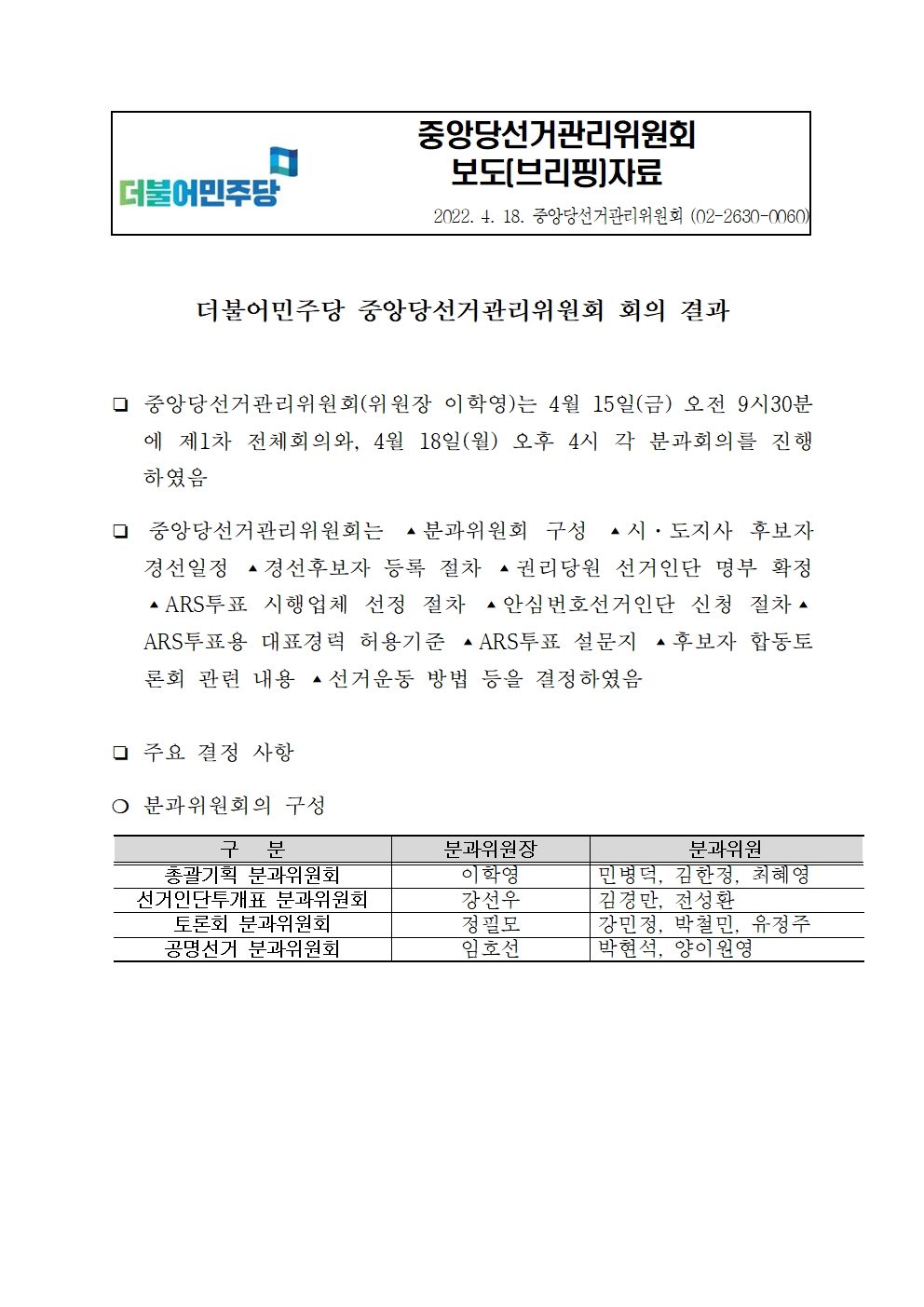 [보도자료] 더불어민주당 중앙당선거관리위원회 회의 결과