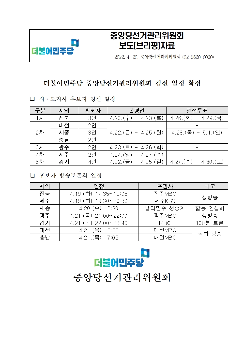 [보도자료] 더불어민주당 중앙당선거관리위원회 경선 일정 확정