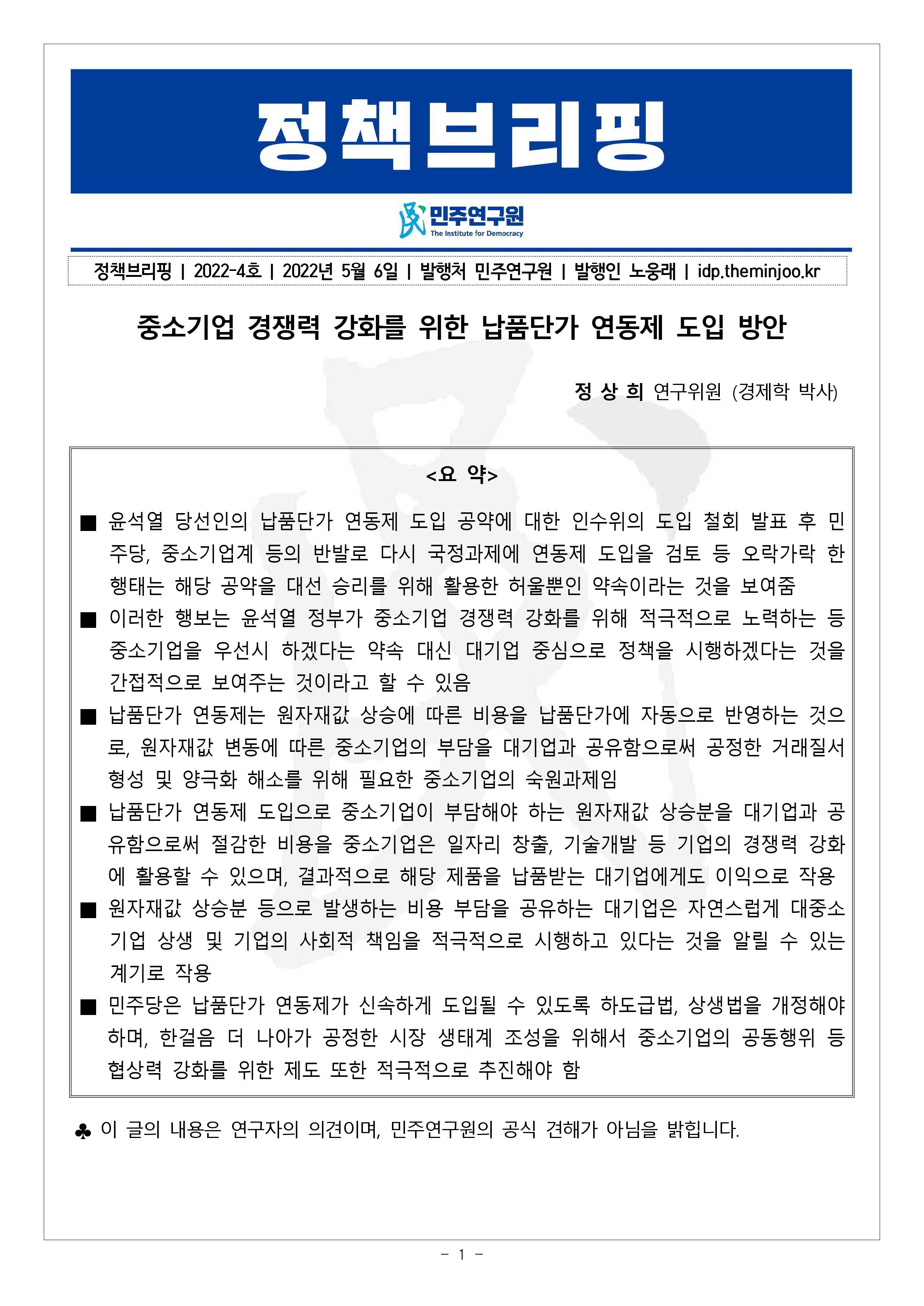 [정책브리핑] 더불어민주당 민주연구원, 중소기업 경쟁력 강화를 위한 납품단가 연동제 도입 방안