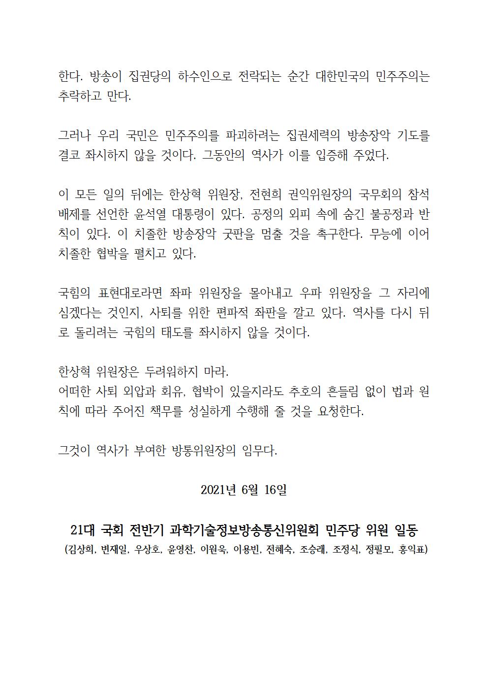 [기자회견문] 21대 국회 전반기 과방위원회 민주당 위원 일동, 윤석열 정부의 방통위원장 사퇴 협박, 방송장악 음모의 시작이다