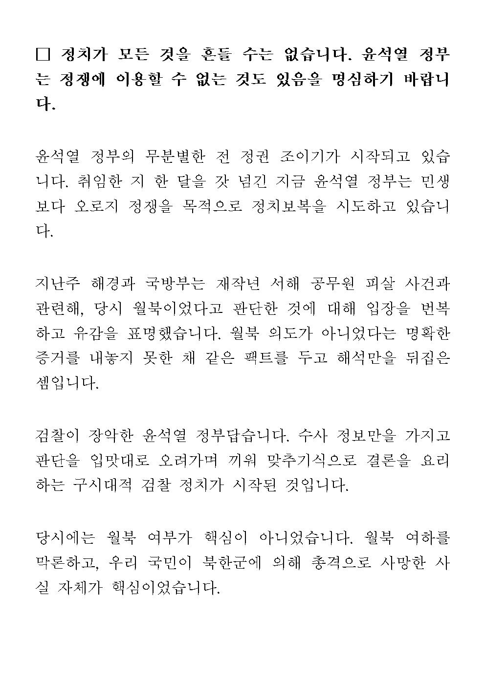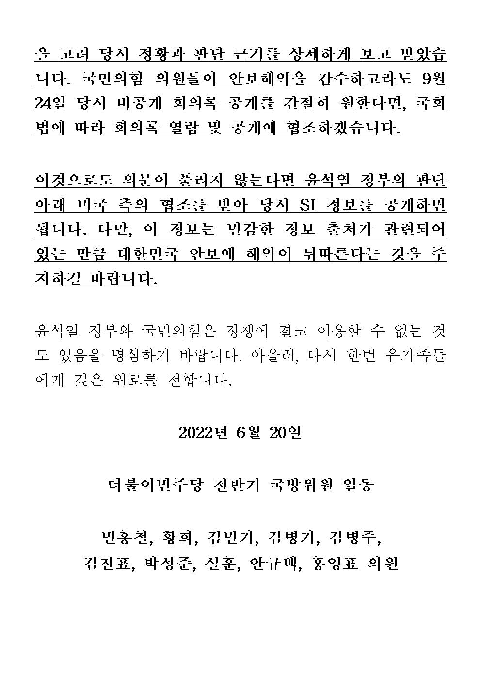 [기자회견문] 더불어민주당 전반기 국방위원 일동, 정치가 모든 것을 흔들 수는 없습니다. 윤석열 정부는 정쟁에 이용할 수 없는 것도 있음을 명심하기 바랍니다