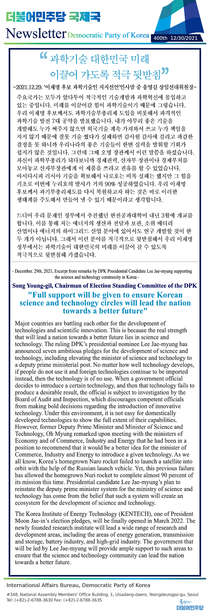 [400th Newsletter]Excerpt from remarks by DPK Presidential Candidate Lee Jae-myung supporting