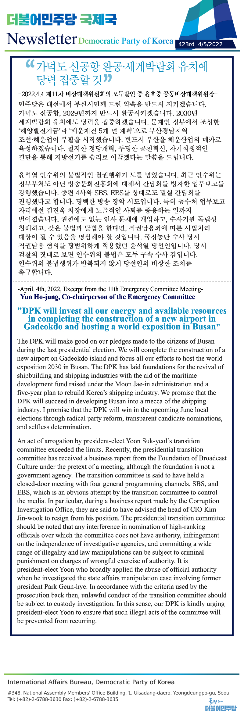 [424th Newsletter] Excerpt from the 12th Emergency Committee Meeting