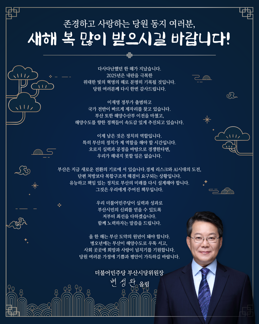 민주당 부산시당 2026 신년인사회 갖고 시민 인사 및 지방선거 승리 다짐 -1/2(금) 10:30 중앙공원 충혼탑 참배, 민주공원 중극장에서 지방의원, 출마예정자 등 400명 참여 더불어민주당 부산시당이 2026년 신년 인사회를 갖고 시민들에 대한 새해 인사와 함께 지방선거 승리를 다짐한다. 변성완 부산시당위원장과 지역위원장, 시·구의원, 지방선거 출마 예정자 등 400여명은 2일 오전 10시 30분 중구 영주동 중앙공원 충혼탑과 민주공원 넋기림마당을 참배한다. 참석자들은 이어 오전 11시에는 민주공원 중극장에서 ‘2026년 해양수도 완성, 부산 재도약’이란 슬로건으로 신년 인사회를 갖고 지방선거 필승을 결의한다. 더불어민주당 부산시당은 신년 인사회를 시작으로 공천관리위원회 등 지방선거 기구 구성과 조직 강화 등 본격적인 선거체제에 돌입한다. 새해 첫 날인 1일에는 정청래 당 대표와 변성완 부산시당 위원장 등 당 지도부가 김해 봉하마을 고 노무현 대통령 묘소를 참배하고 양산 평산마을을 찾아 문재인 전 대통령도 예방할 예정이다. 변성완 시당위원장은 “병오년 새해를 맞아 부산 시민들께 건강과 행복이 가득하기를 기원하며, 이재명 정부 출범과 함께 국정 전반이 빠르게 제자리를 찾고 있는 만큼 2026년을 해양수도 완성과 부산 재도약의 원년으로 만들기 위해 민주당 부산시당이 실력과 성과를 통해 시민들의 신뢰를 얻을 수 있도록 노력하겠다”고 새해 인사를 전했다. 더불어민주당 부산광역시당