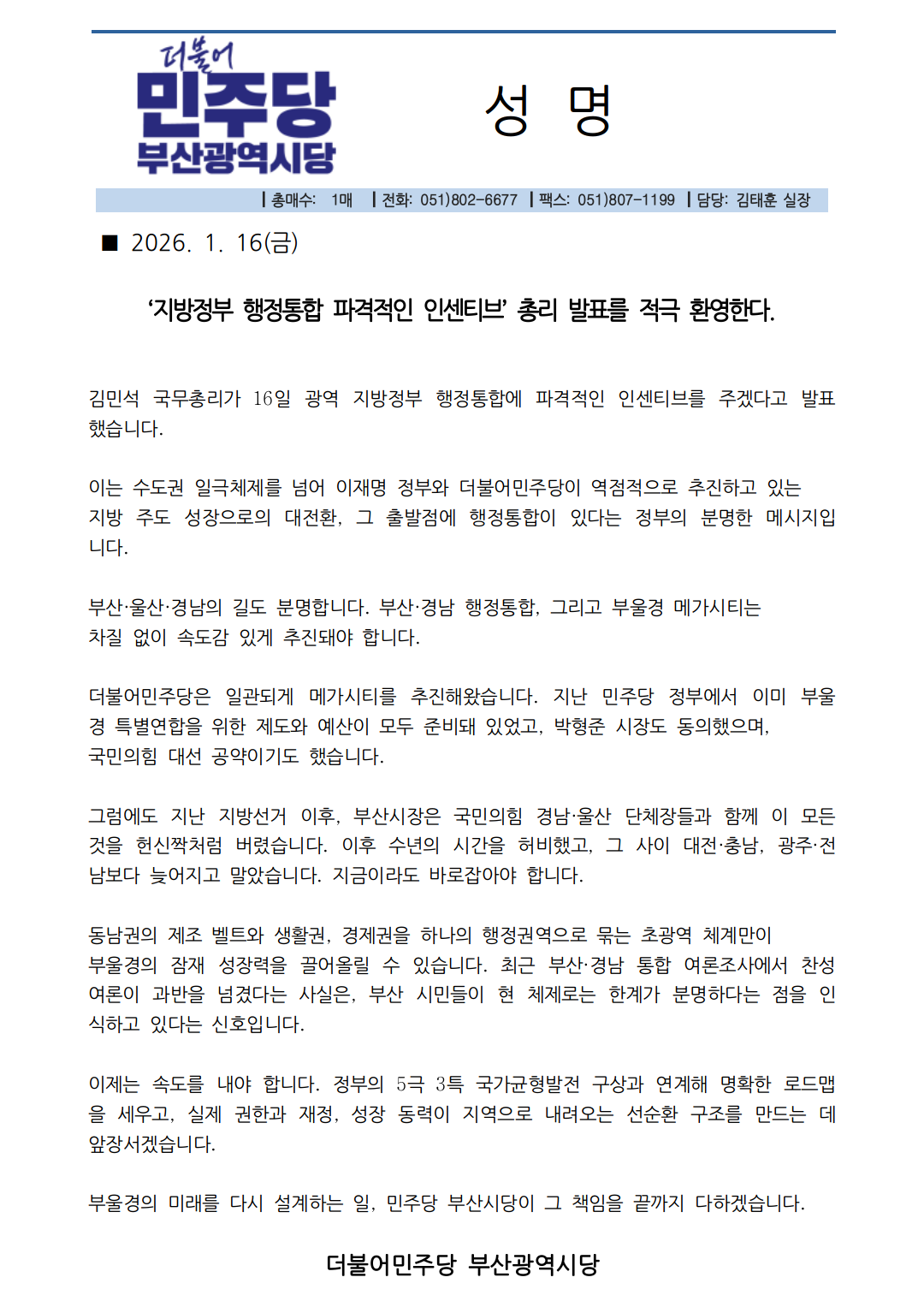 '지방정부 행정통합 파격적인 인센티브’ 총리 발표를 적극 환영한다