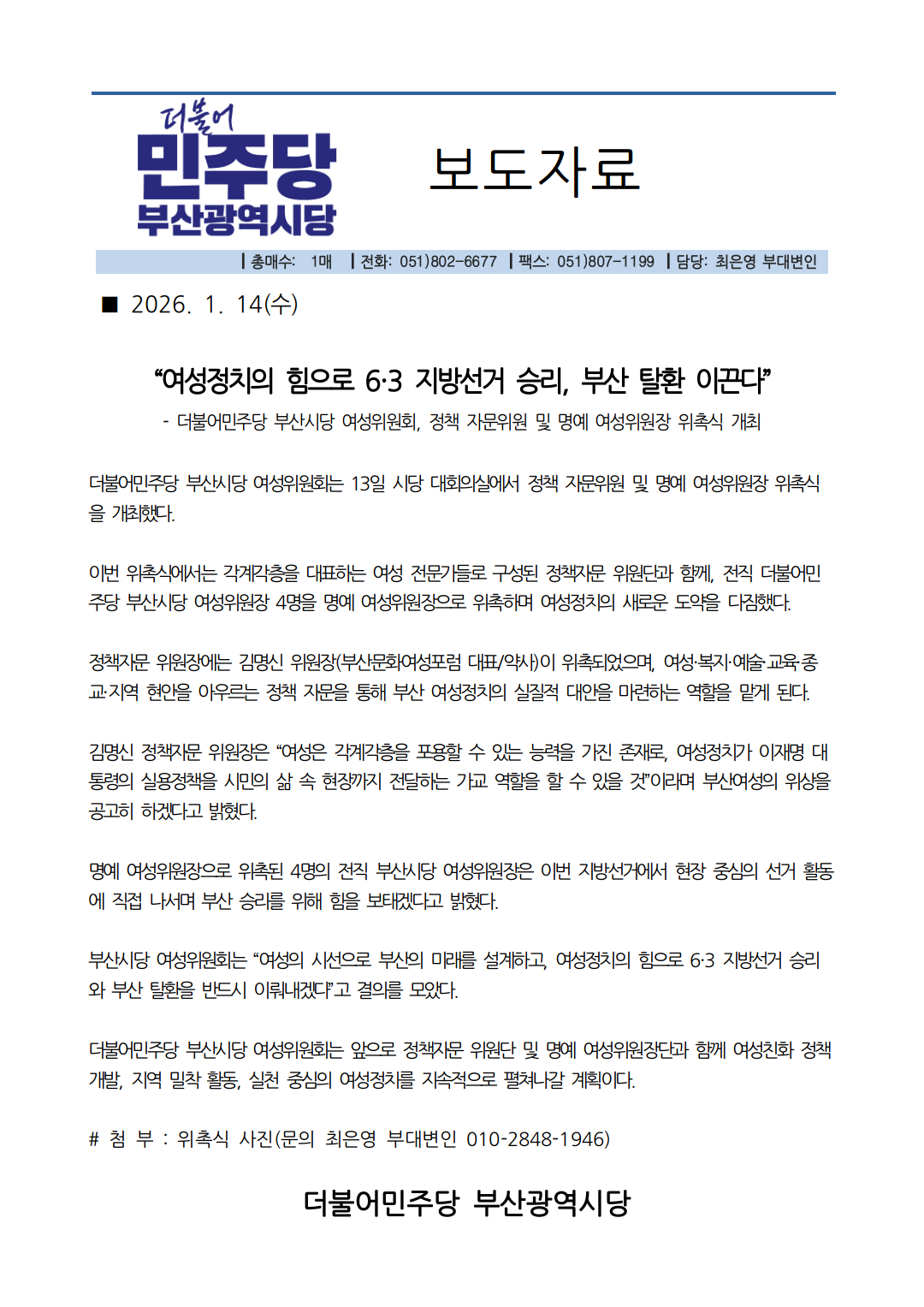 여성정치의 힘으로 6·3 지방선거 승리, 부산 탈환 이끈다