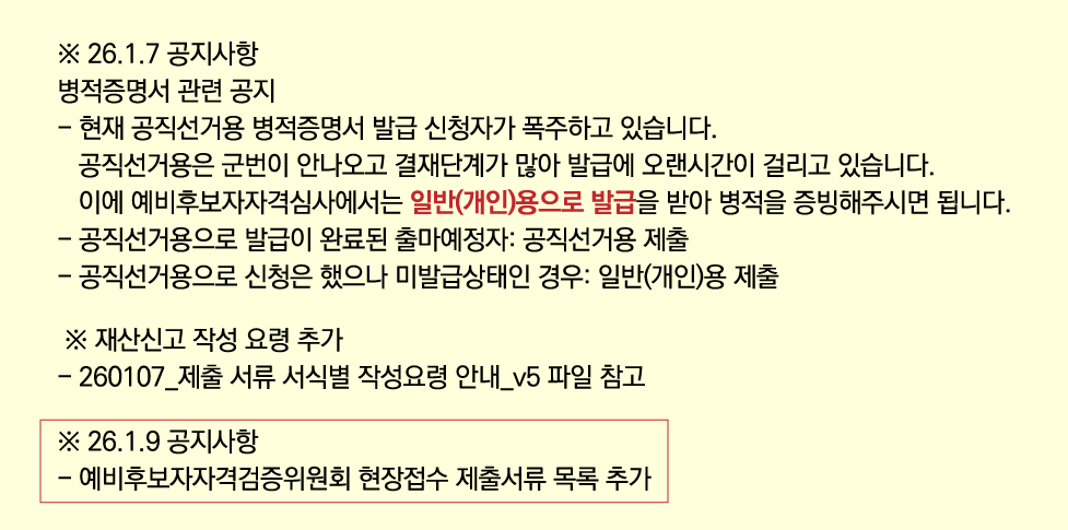 * 공직후보자 범죄경력회보서: 발급까지 14일 소요되고 있는 상황이므로 즉시 신청 필요