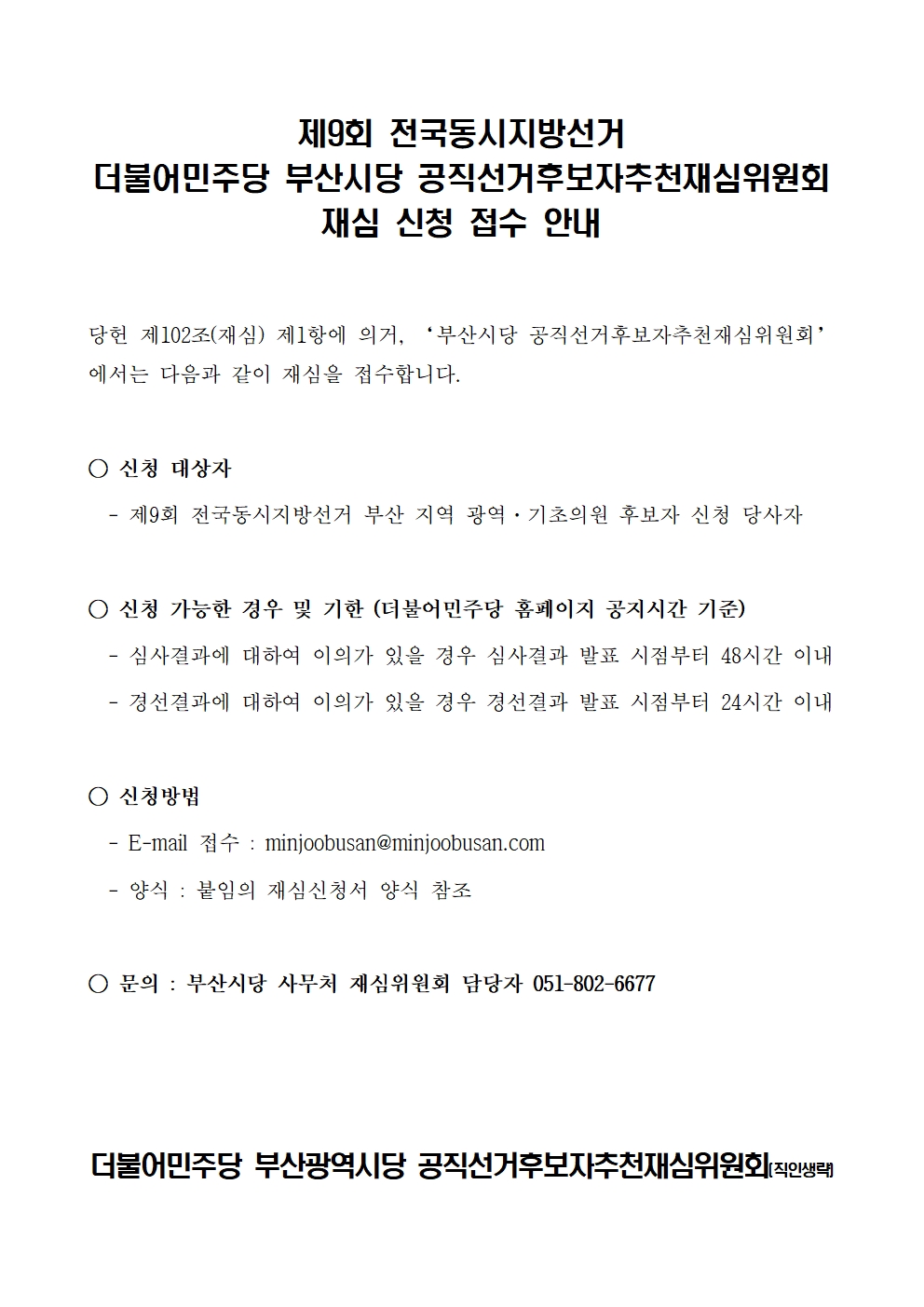 당헌 제102조(재심) 제1항에 의거, ‘부산시당 공직선거후보자추천재심위원회’에서는 다음과 같이 재심을 접수합니다.