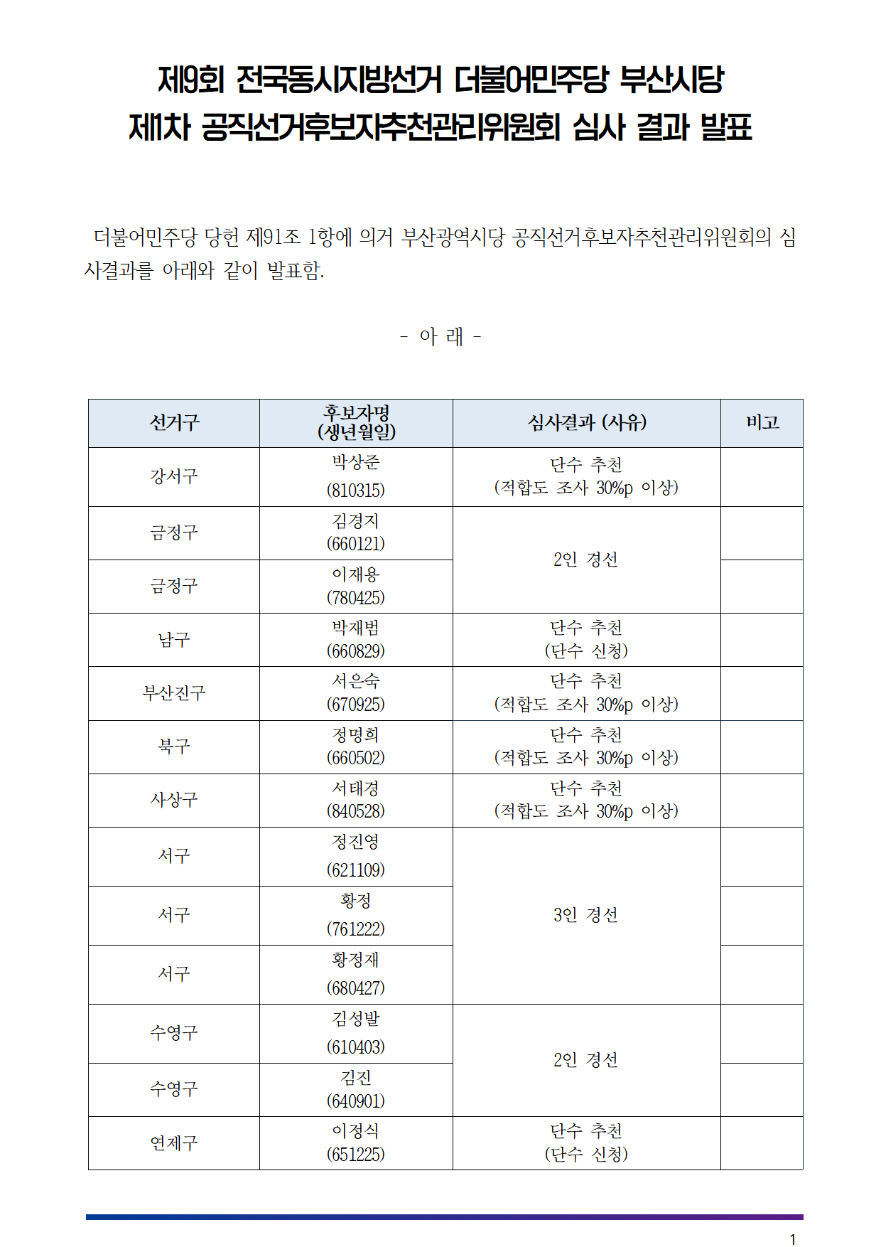 제1차 공직선거후보자추천관리위원회 심사 결과 발표