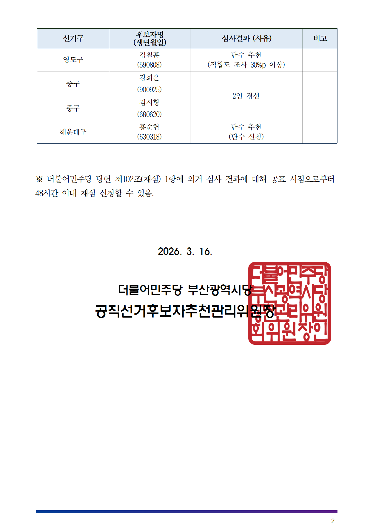 ※ 더불어민주당 당헌 제102조(재심) 1항에 의거 심사 결과에 대해 공표 시점으로부터 48시간 이내 재심 신청할 수 있음.