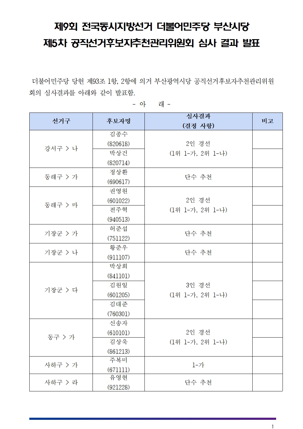 제5차 공직선거후보자추천관리위원회 심사 결과 발표(표기 오류 수정)