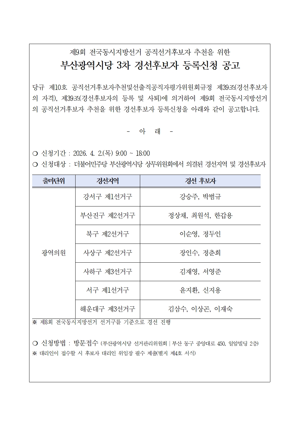 부산광역시당 3차 경선후보자 등록신청 공고