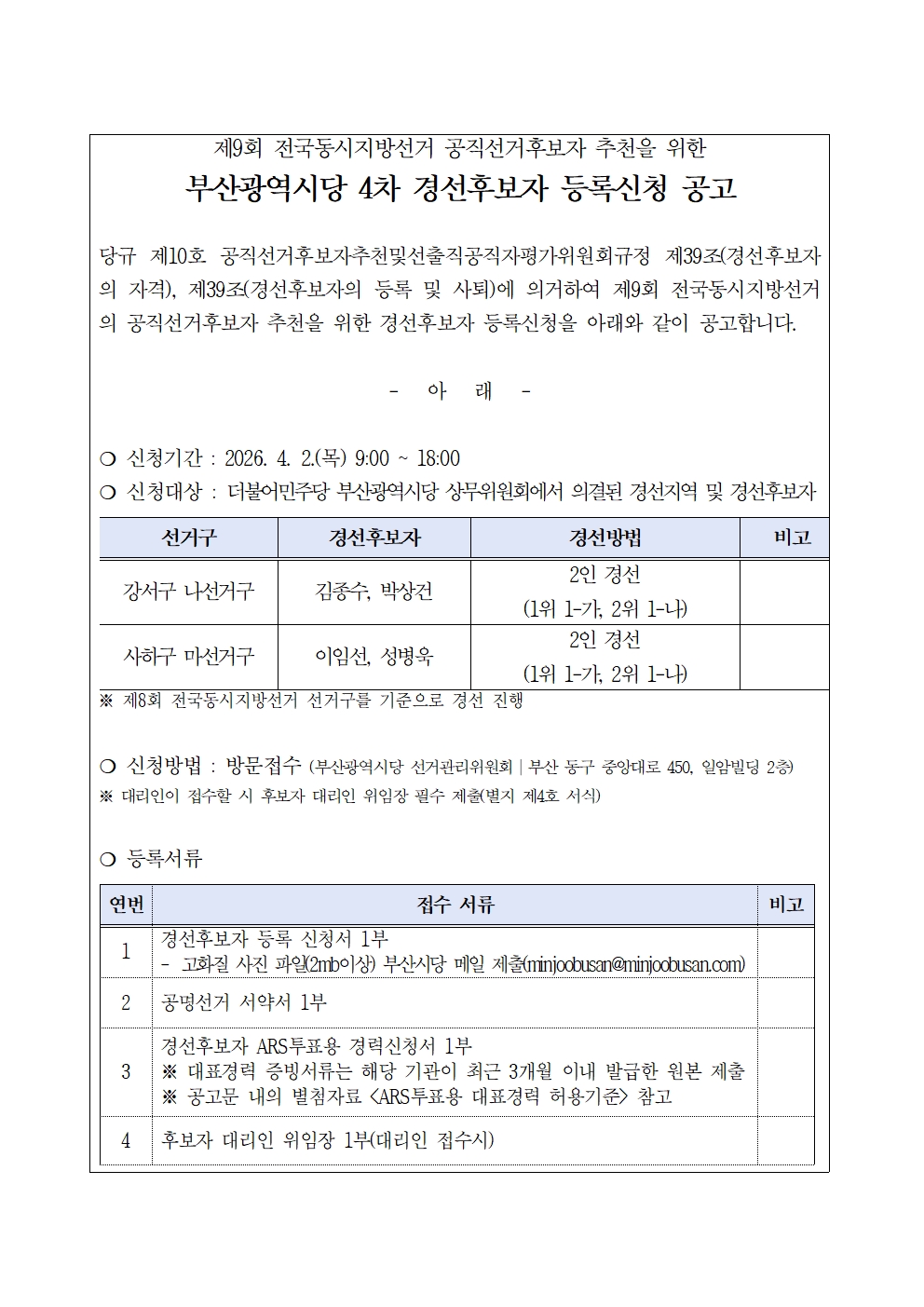 부산광역시당 4차 경선후보자 등록신청 공고
