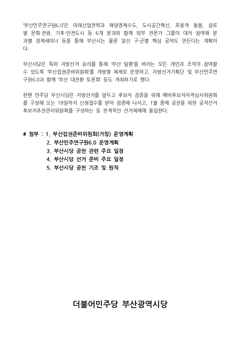 부산시당은 특히 지방선거 승리를 통해 ‘부산 탈환’을 바라는 모든 개인과 조직이 참여할 수 있도록 ‘부산집권준비위원회’를 개방형 체제로 운영하고, 지방선거기획단 및 부산민주연구원6.0과 함께 ‘부산 대전환 토론회’ 등도 개최하기로 했다.