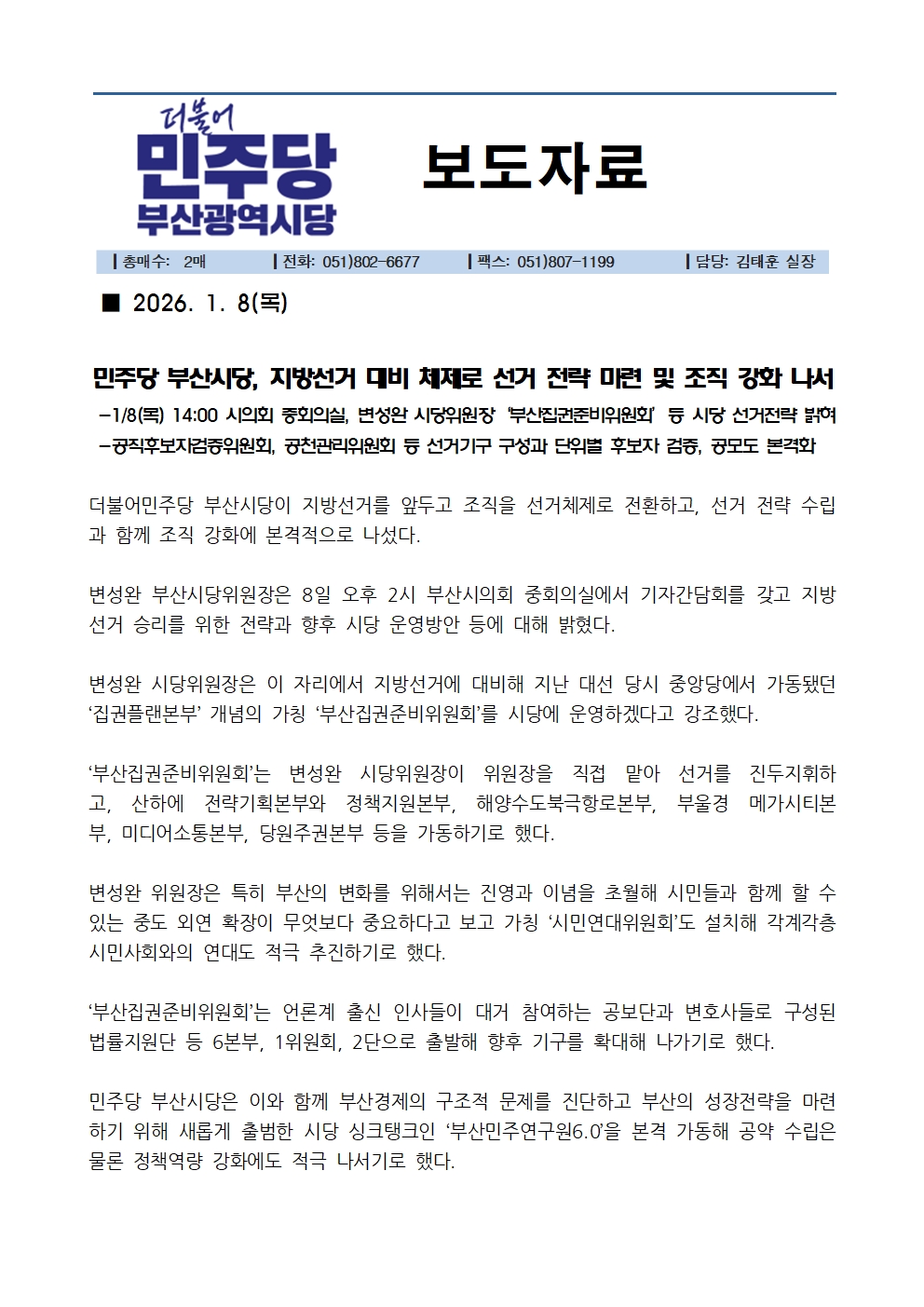 -1/8(목) 14:00 시의회 중회의실, 변성완 시당위원장‘부산집권준비위원회’등 시당 선거전략 밝혀