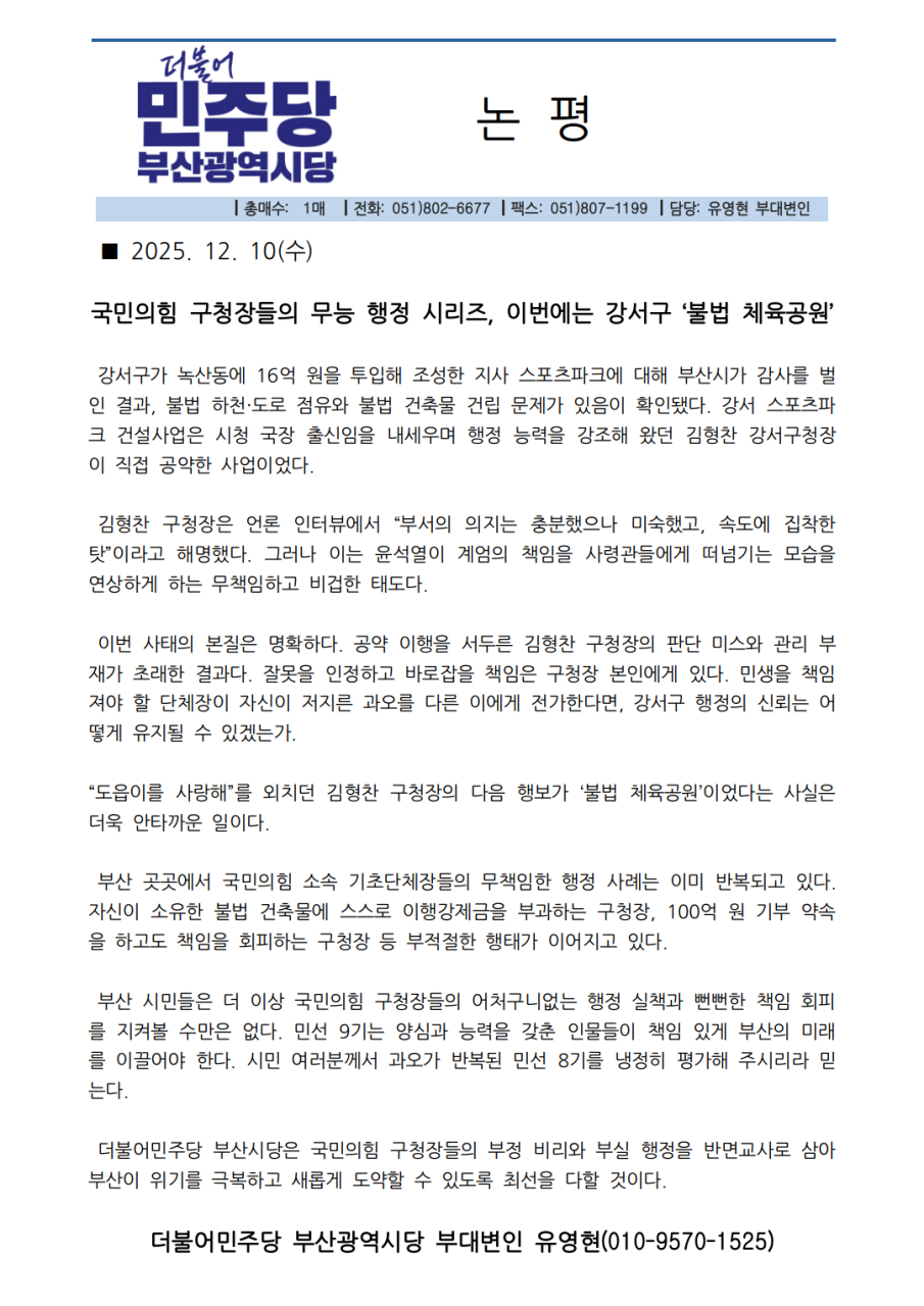 부산 곳곳에서 국민의힘 소속 기초단체장들의 무책임한 행정 사례는 이미 반복되고 있다. 자신이 소유한 불법 건축물에 스스로 이행강제금을 부과하는 구청장, 100억 원 기부 약속을 하고도 책임을 회피하는 구청장 등 부적절한 행태가 이어지고 있다.