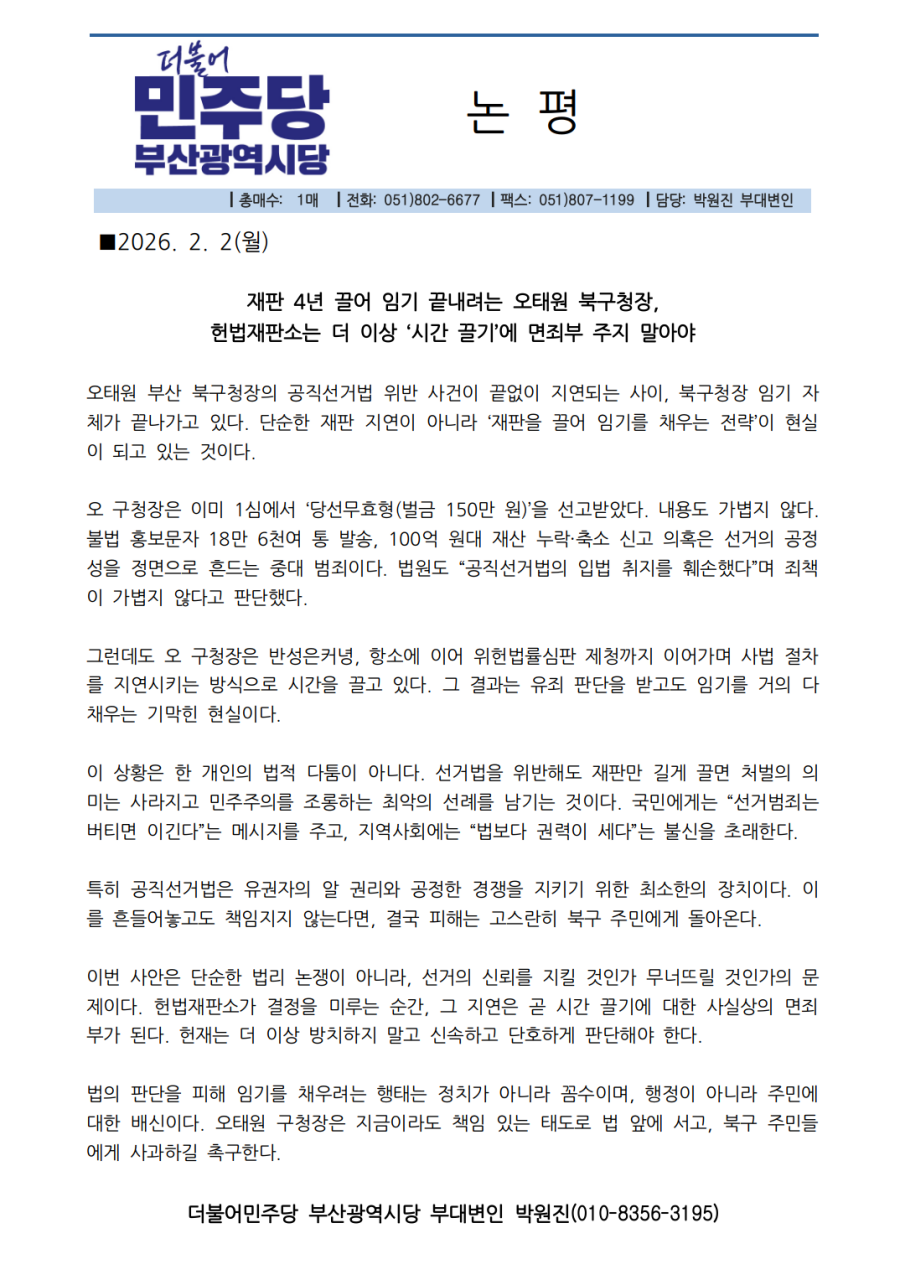 법의 판단을 피해 임기를 채우려는 행태는 정치가 아니라 꼼수이며, 행정이 아니라 주민에 대한 배신이다. 오태원 구청장은 지금이라도 책임 있는 태도로 법 앞에 서고, 북구 주민들에게 사과하길 촉구한다.